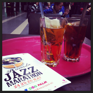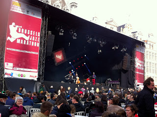 Falta de espectadores não havia por ali, uns sentados, outros em pé, outros de passagem... o importante é que teve adesão, como era merecido! Nós não estivemos muito tempo parados, mas ainda conseguimos ouvir dois grupos e tomar um chá no Café des Halles , em Saint Géry. Para mim, um local a colocar no roteiro de uma visita à cidade. Parece uma galeria de arte urbana, com um café no meio. De dia até podemos encontrar grupos de pessoas a jogar damas ou xadréz e à noite a música alta, acompanha uma passagem pelas exposições que existem por ali.