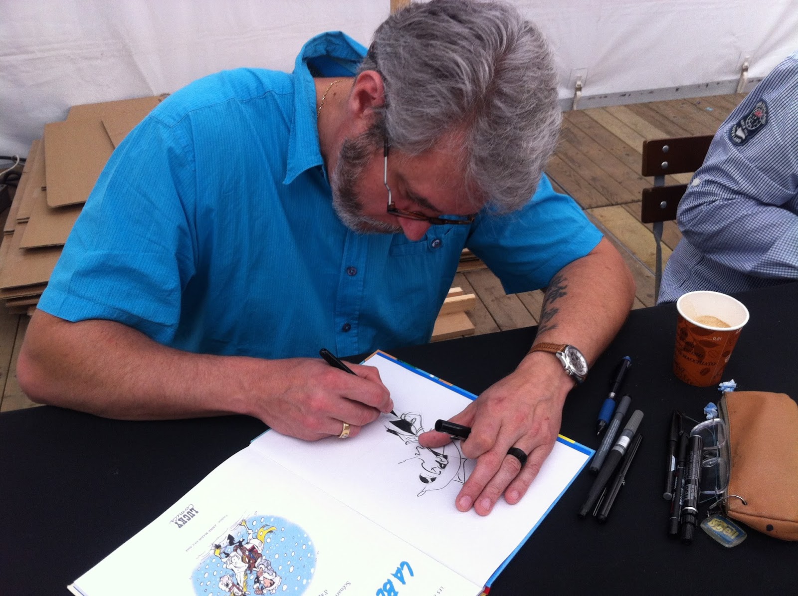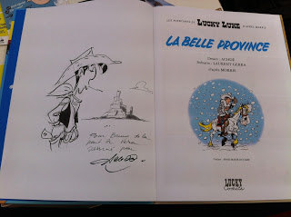 À saída fui surpreendida pelo festival de banda desenhada que estava a decorrer neste fim de semana, aproveitei para dar uma vista de olhos, enquanto filho e marido não chegavam. Houve tempo para visitar a história do Tintin, entre outros personagens bem nossos conhecidos. Mas o mais incrível foi ter conseguido um livro, do clássico Lucky Luke, autografado/caricaturado pelo seu autor. O sortudo foi mesmo o senhor meu marido que teve direito a dedicatória especial e tudo!!!