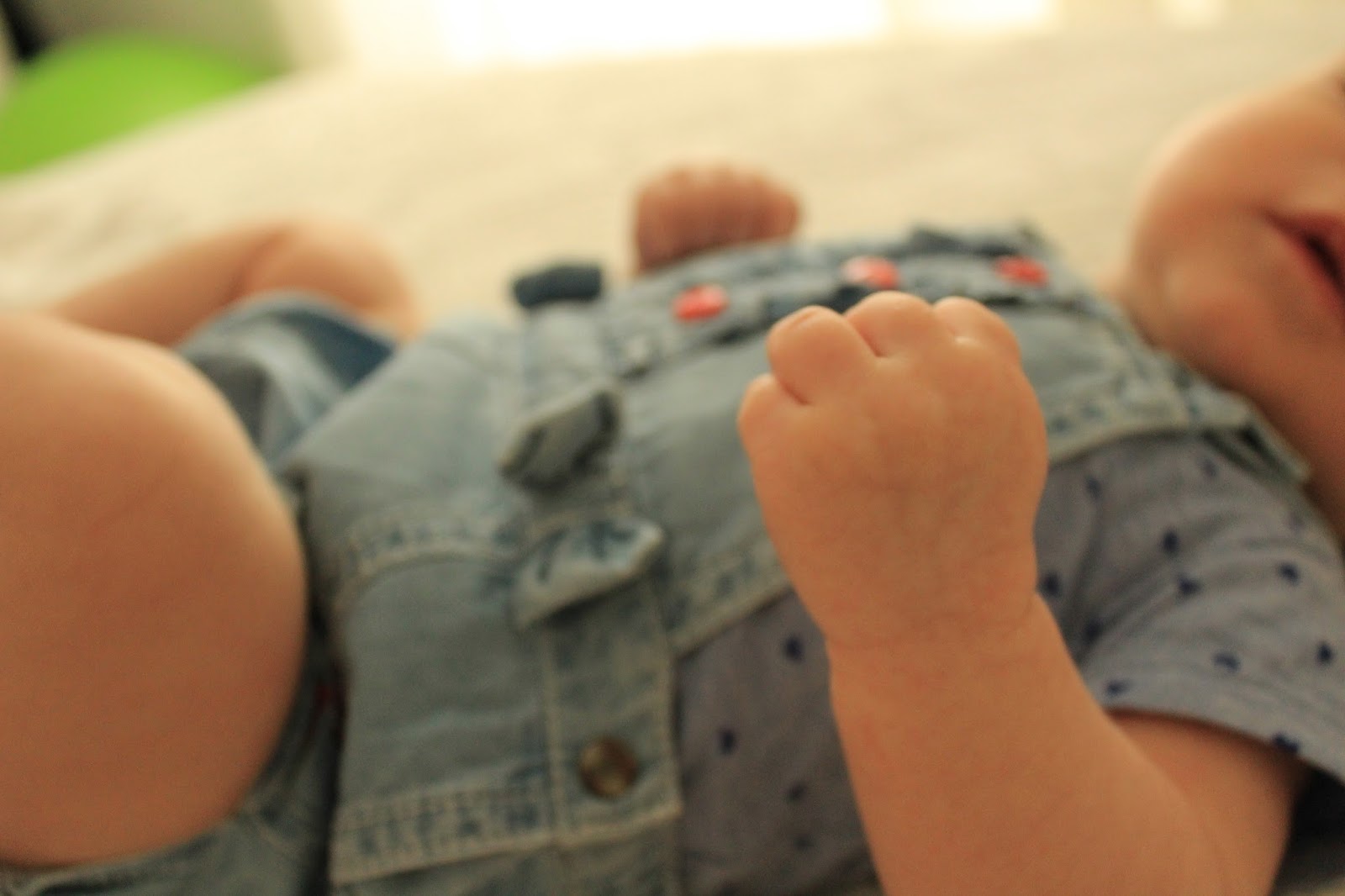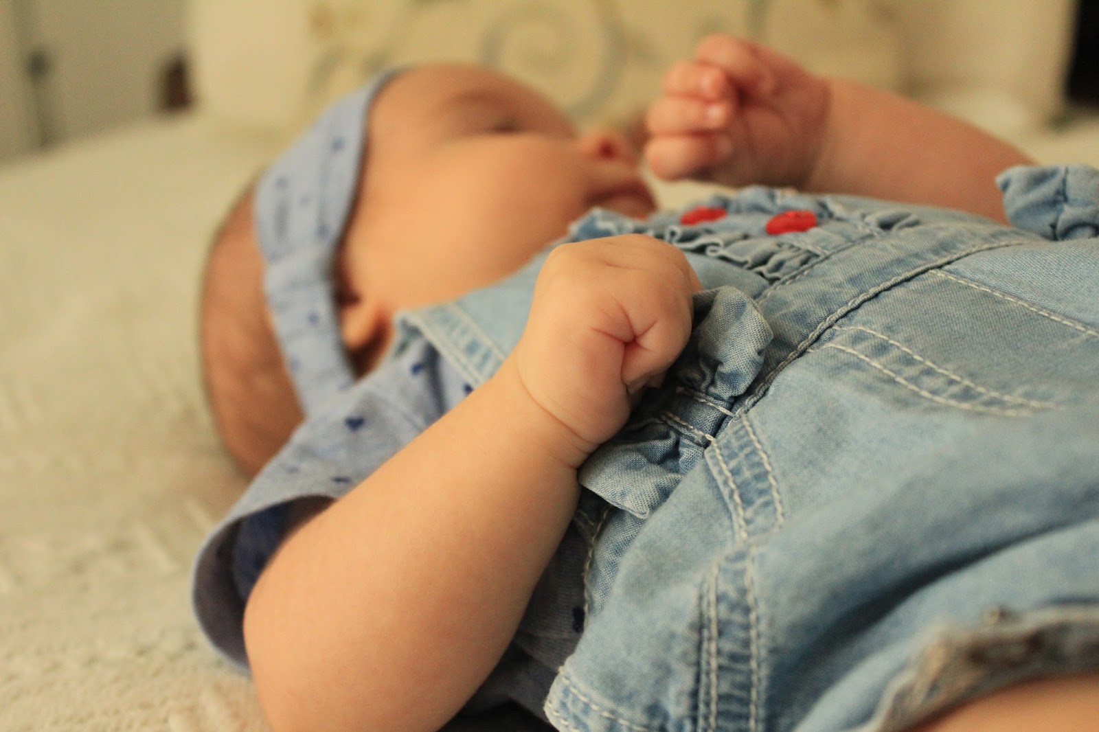 Desta vez, aproveitei que tínhamos roupa nova - este macacão amoroso em ganga da 3POMMES - no armário por estrear, vesti-a e depois, é só deixá-la explorar tudo aquilo que já gosta de fazer: esticar-se, meter as mãos na boca, rir, também gosta de fazer caretas... e assim ficamos um bom bocado, até chegar uma nova birrinha de sono e eu, cheia de confiança, pelo menos, volto a tentar que adormeça - nem sempre tenho sorte, mas o pensamento é sempre o mesmo: ela está tão cansada que vai ter que acabar por adormecer!