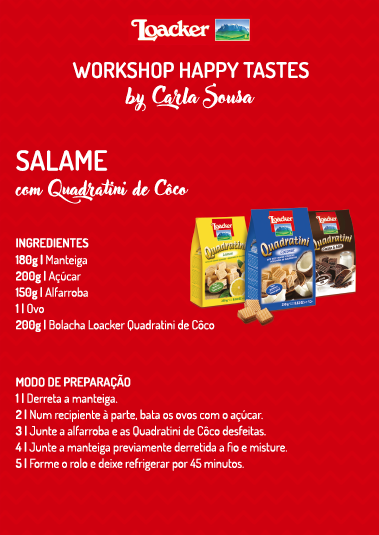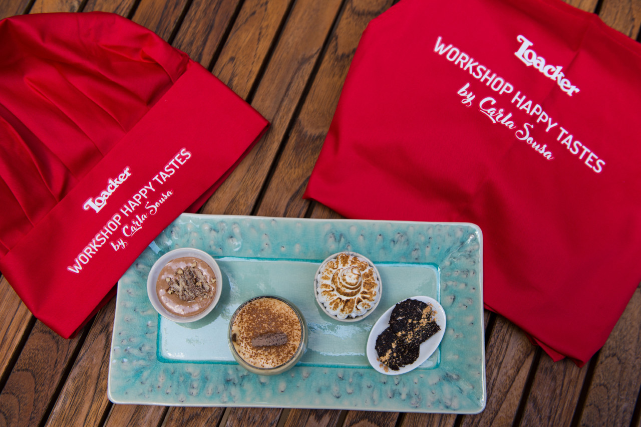 Na semana passada estive no workshop "Happy Tastes" da Loacker, no Hotel Valverde, em Lisboa, pela mão da chef Carla Sousa, para experimentar três sobremesas. Foi um fim de tarde em boa companhia, no qual fomos todos surpreendidos com a versatilidade das bolachas wafers - que eu adoro - em formato de mini quadradinhos e que se comem como se fossem pipocas.