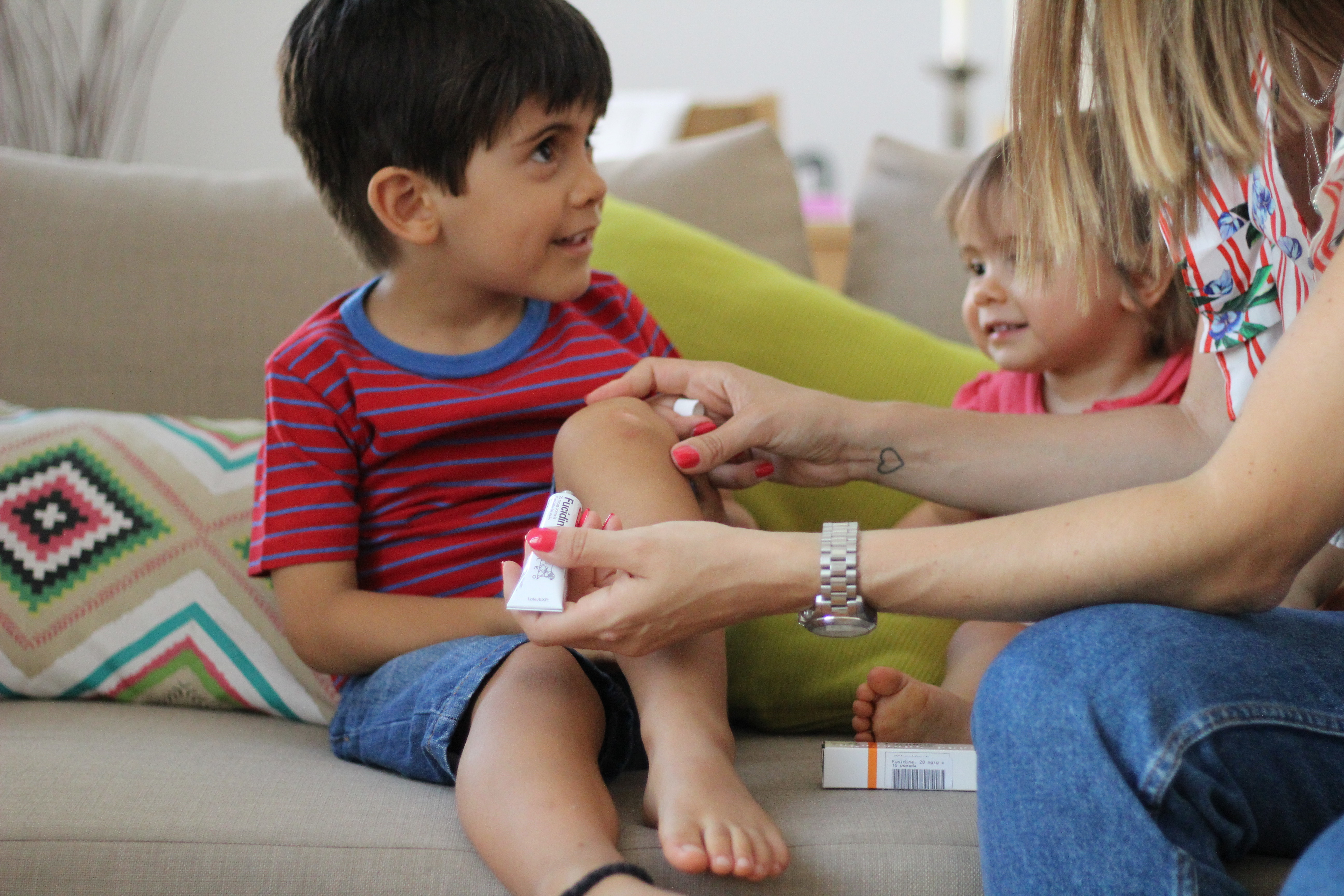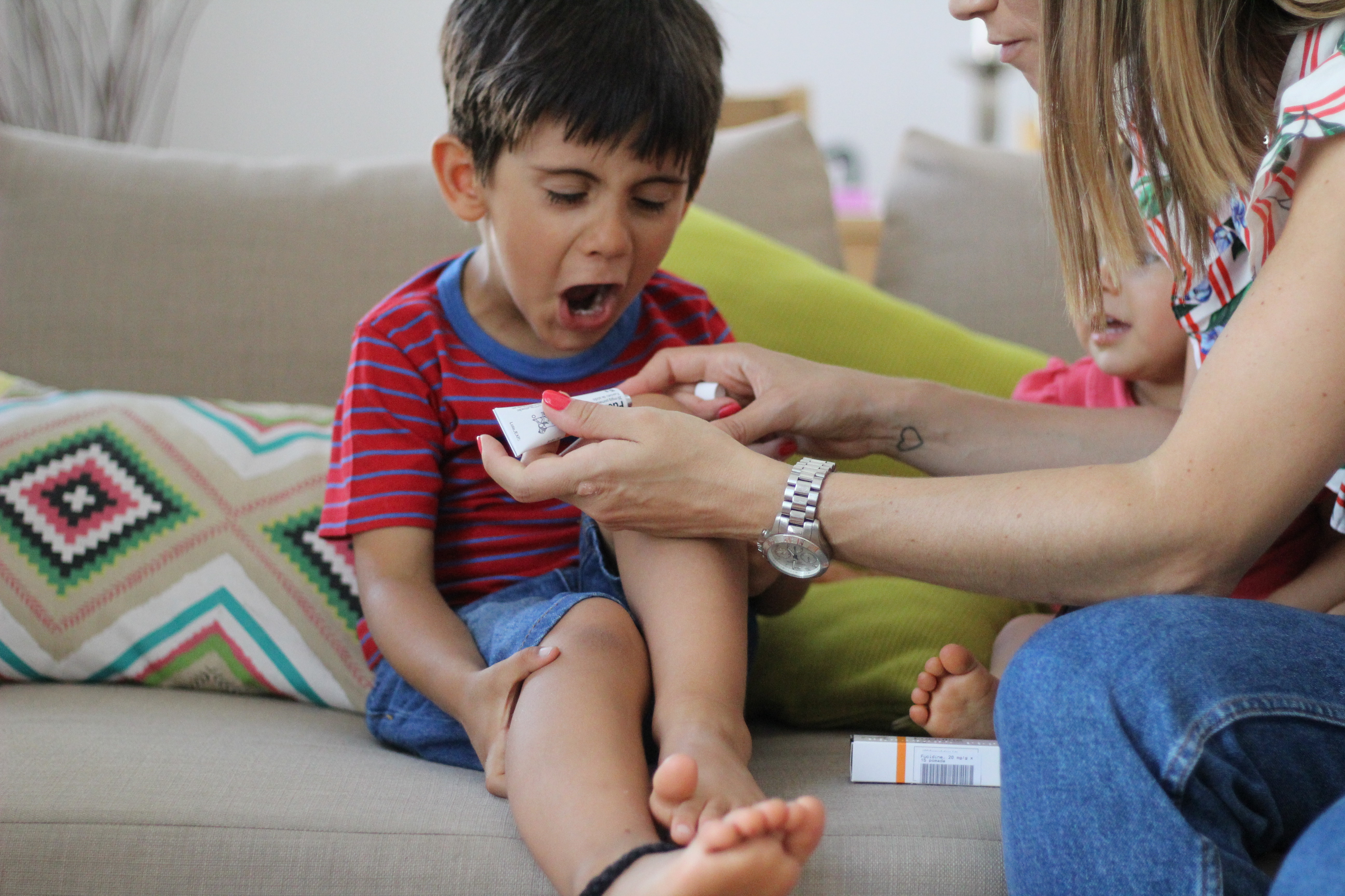 Quando me juntei, já o Vicente estava num pranto, com o joelho todo esfolado e cheio de sangue – se vê sangue, está tudo estragado! Em primeiro lugar, há que tentar acalmá-lo para, depois, se tratar do ferimento. Eu já tive que desinfectar algumas esfoladelas, mas foi apenas a segunda vez que tive que tratar uma ferida mais profunda. O mais difícil nem é por mim, pois não me faz muita impressão. É mais por ele, que chora e grita sem sequer me ouvir. Regra geral, começo por lavar com soro, desinfecto e, no final, aplico um pouco de Fucidine em pomada. Aliás, costumo ter sempre por perto, seja em casa, seja de viagem ou em férias, anda sempre connosco. Facilita bastante quando temos que tratar alguma coisa relacionada com a pele.