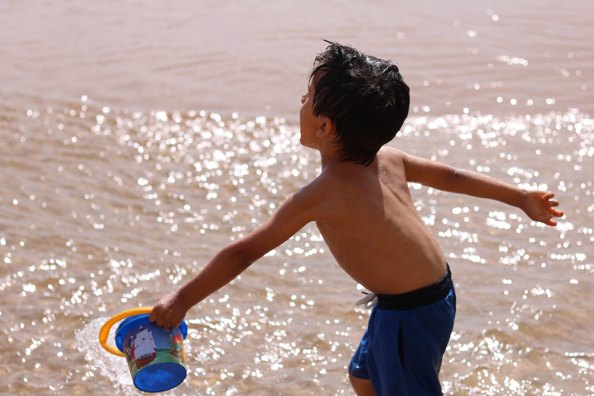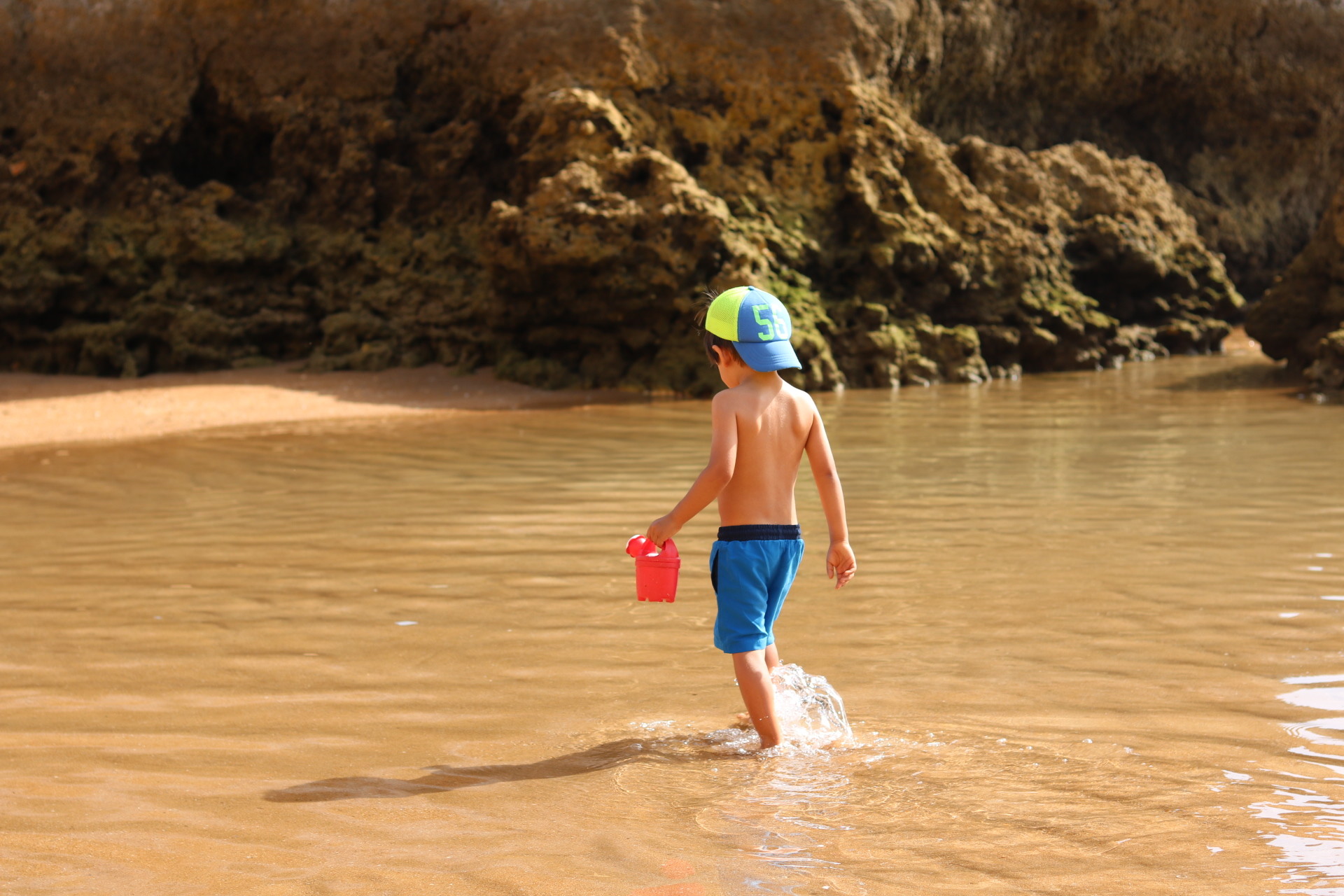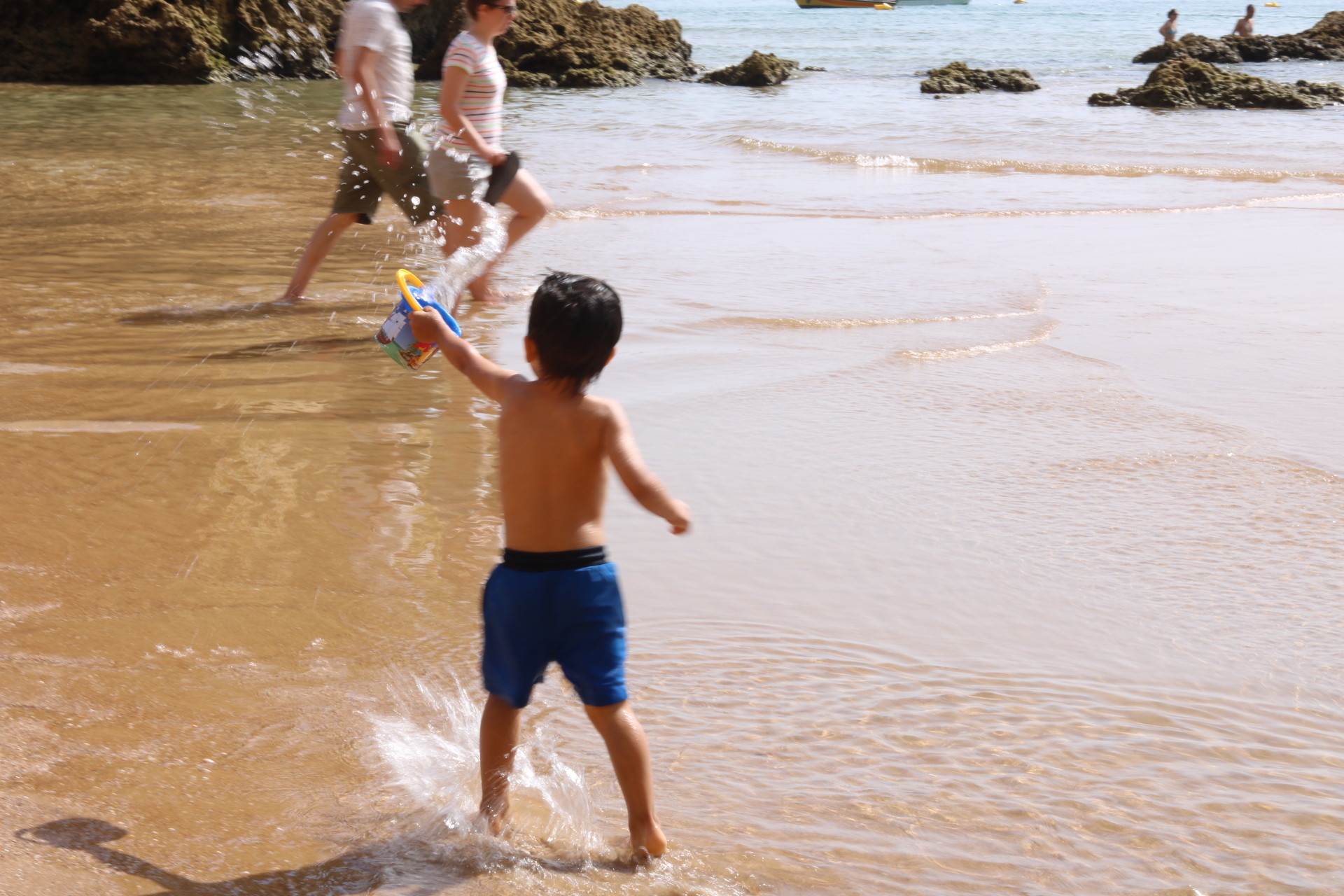 Mas a praia da Dona Ana, durante a manhã, faz duas "piscinas" que vão desaparecendo até a maré encher. Sentei os dois a brincar junto de mim, na areia molhada, mar com poucas ondas e uma das "piscinas" ali ao nosso lado. Não foi preciso pedir muito para que fosse ele próprio buscar água, não foi preciso de todo pedir-lhe para chapinhar na água e para se molhar. Ele próprio foi ganhando confiança e os meus olhos brilhavam com a sua felicidade ali, sozinho, a brincar na água. Nunca o tinha visto com os calções molhados na praia, quanto mais o cabelo. E hoje saiu de lá completamente encharcado. Brincou até mais não e pediu para ir à água.