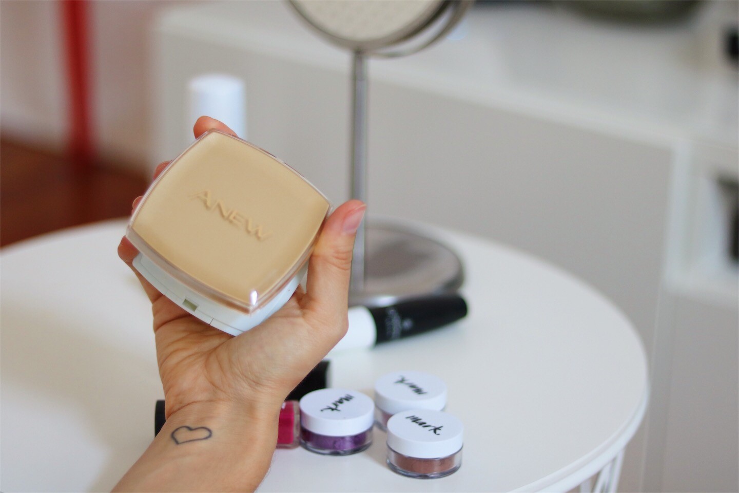 O pó compacto Rejuvenescedor ANEW - que gosto de usar para fixar a base e o corrector. Até agora só tinha usado pó translúcido e queria muito experimentar um com cor e aqui está ele.