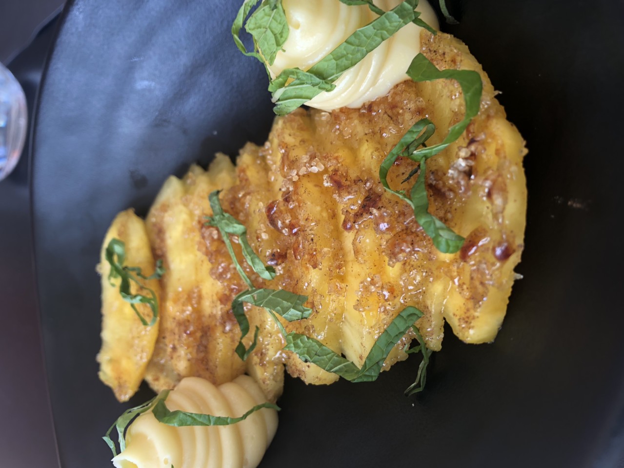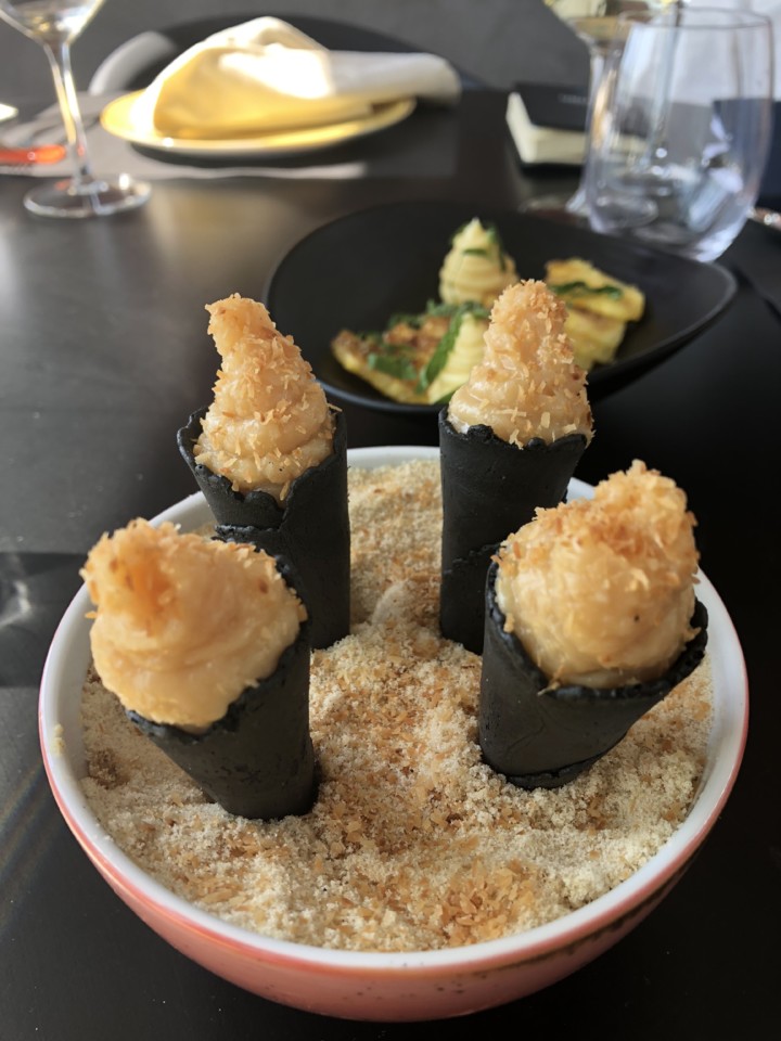 Depois, passamos ao menu. Entradas, prato principal e sobremesa. Iniciamos o almoço com uma entrada de amêijoas (as amêijoas mergulhadas no refrescante molho de Garam Masala) e sopa de Quiabo, de seguida, e como prato principal provamos um prato de carne (Gulosos lombinhos de borrego neozelandês) e outro de peixe (Dourada grelhada com molho de tamarindo), como acompanhamentos, havia Arroz Basmati com côco e sementes de sésamo e legumes salteados. E o toque asiático prossegue até às sobremesas e uma mesa destas a partilhar por quatro pessoas deixou um espacinho para provar algumas das iguarias da carta. E, também a partilhar, tivemos direito a Ananás grelhado com canela e gelado de Yuzu e a Cones de bolacha com recheio de creme de côco queimado doce…. simplesmente di-vi-nal!!!!
