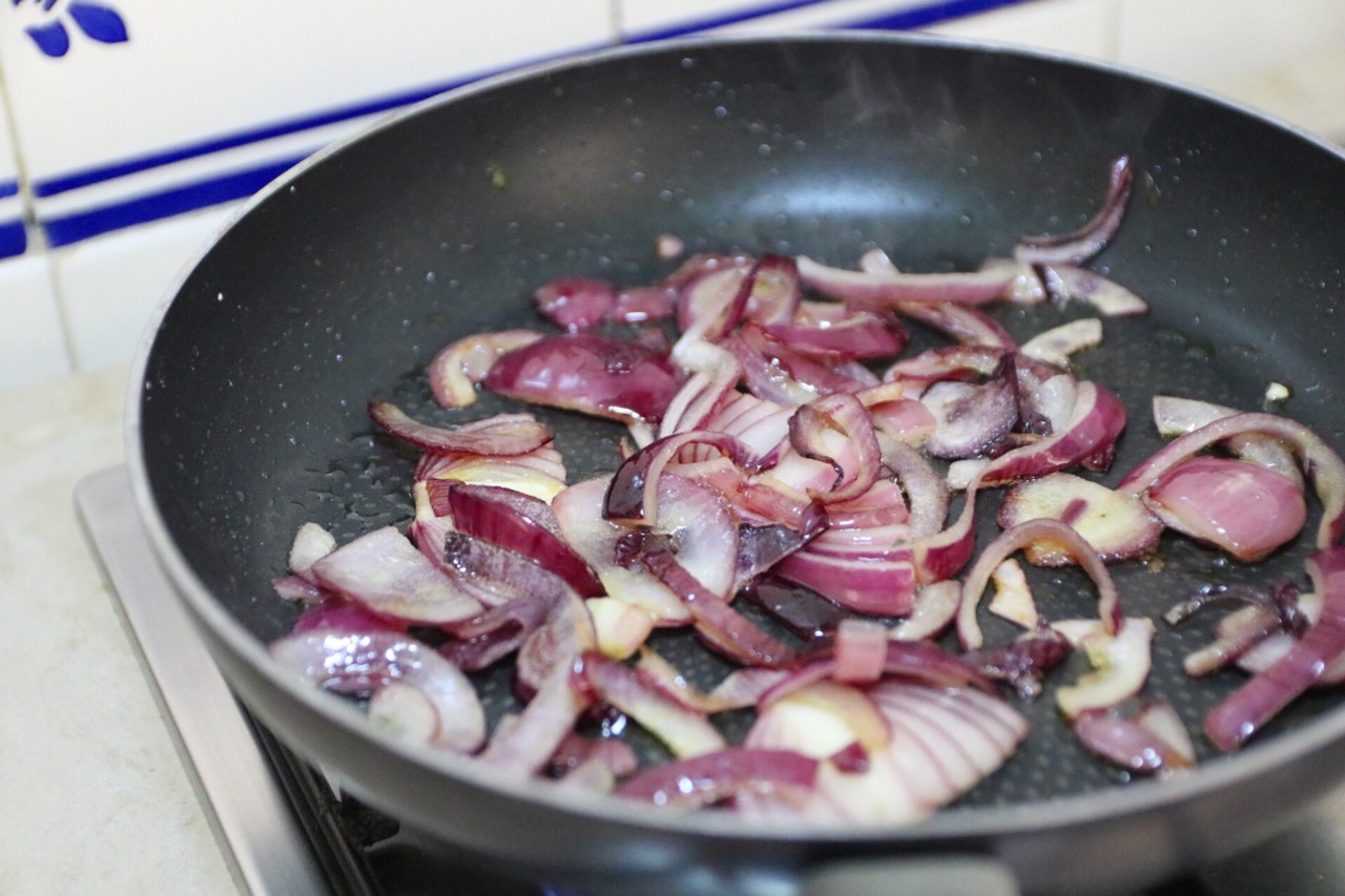 Cortar 1 cebola roxa grande em tiras, não muito finas, para evitar queimar. Entretanto, numa frigideira antiaderente, colocam o azeite, de forma a cobrir todo o fundo, onde colocam toda a cebola ainda antes de começar a ficar muito quente. Em lume brando e com muita paciência, deixar a cebola cozinhar aos poucos, à medida que liberta a água e adquire uma consistência mais mole e tom acastanhado. No meu caso, eu não uso açúcar. Chamo-lhe caramelizada pois a cebola roxa é mais “doce” do que a normal e, desta forma, fica ainda mais doce. Por fim, juntam as especialidades vegetarianas e deixam “cozinhar” para ganhar o sabor da cebola.