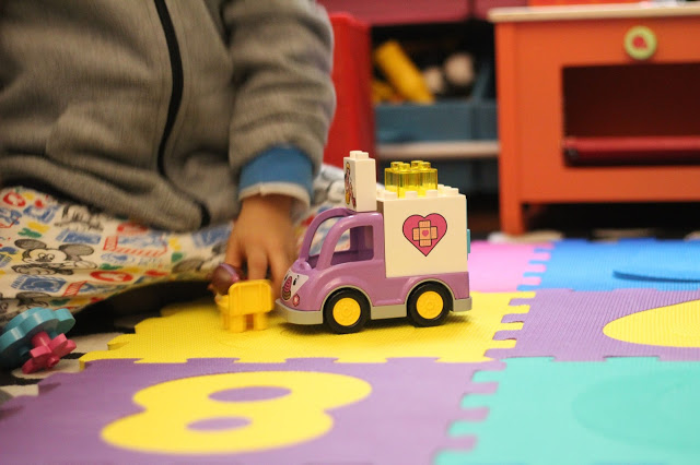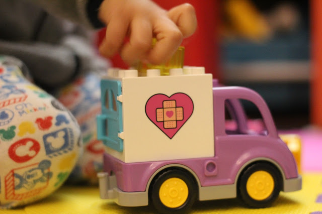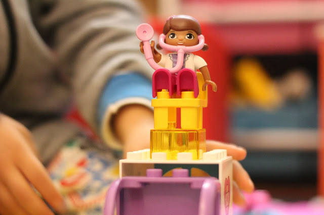 Por aqui, é o Lego Duplo que mais agrada ao menino cá de casa, tem alguns, um deles é o da Dra. Brinquedos.