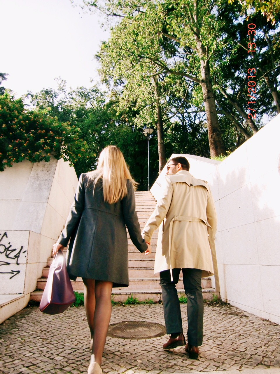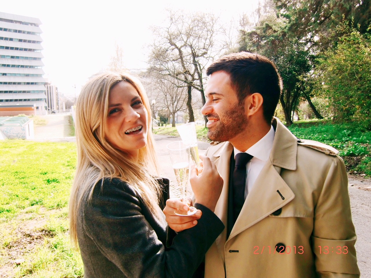 E, como tal, só tenho que agradecer ao casal de amigos que nos acompanhou, pois hoje em dia já não são necessárias testemunhas. Consigo levaram a máquina fotográfica e uma garrafa de champagne, que abrimos no Parque Eduardo VII. No grande dia, não esquecemos também as alianças e eu, como qualquer outra noiva, fiz questão de levar uma coisa azul, uma coisa usada, uma nova e uma emprestada. Posso dizer-vos que a usada foi mesmo o vestido que usei, pois claramente que na minha condição e na loucura de querermos casar antes do Vicente nascer, achei que era ainda mais louca se fosse tentar arranjar algo mais “sofisticado” para dizer o sim. Quer dizer, nem sei bem qual seria a alternativa, pois sem vestido de noiva, a alternativa seria ir normal, acho eu.