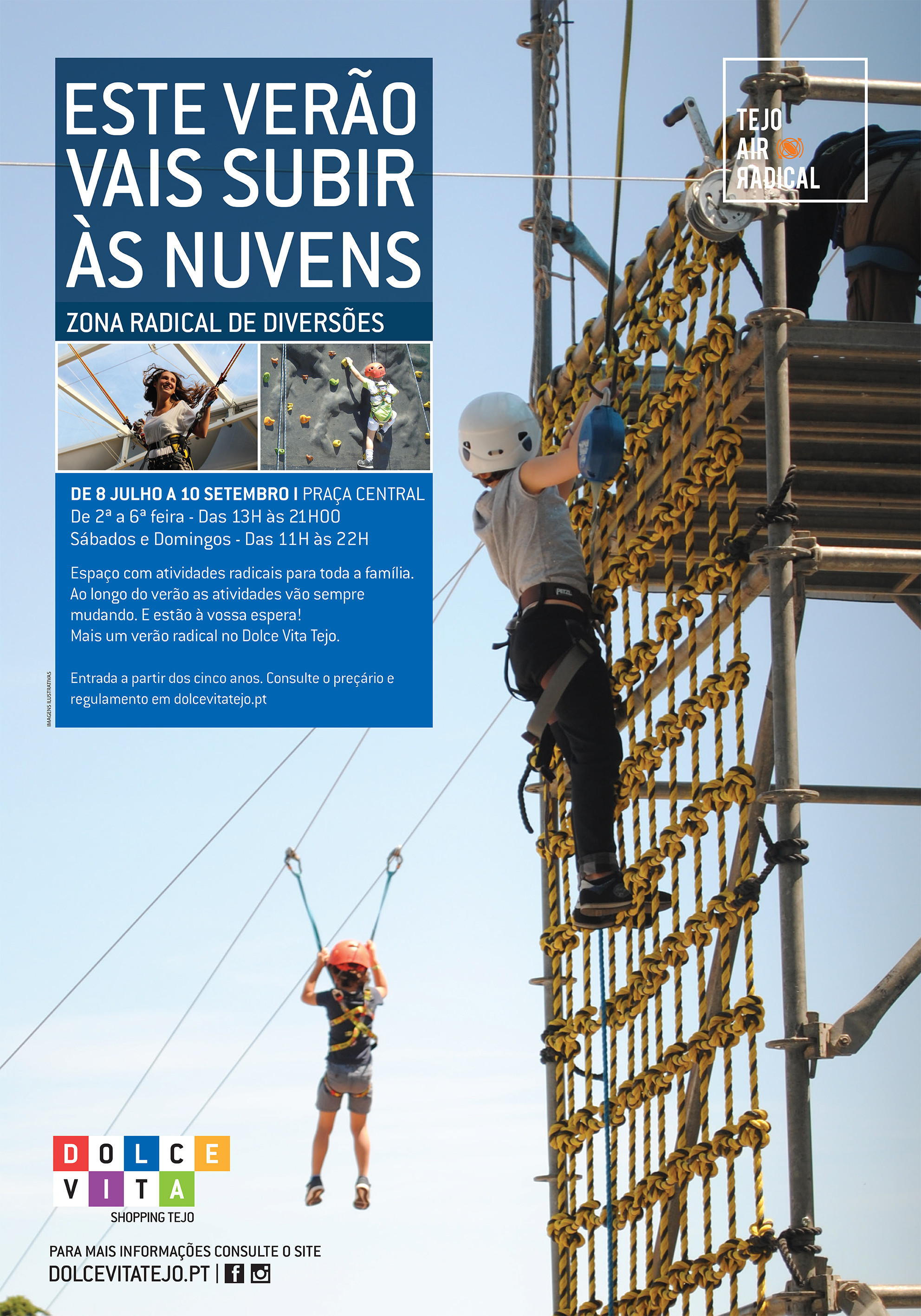 Miúdos e graúdos - miúdos com mais de 3 anos e graúdos com menos de 60 anos - estão convidados a visitar o espaço Tejo Air Radical, situado na Praça Central do Dolce Vita Tejo, onde a diversão é a palavra de ordem. Afinal, as férias de verão não têm que ser apenas sinónimo de praia, podem ser também sinónimo de actividades radicais. Porque não? :)