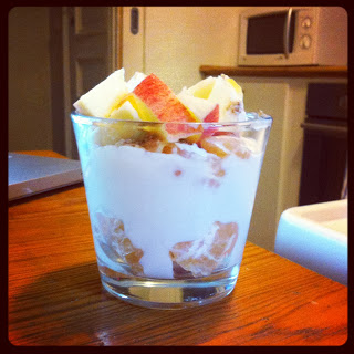 Taça com 1 clementina + iogurte de soja natural + linhaça moída + 1/4 de maçã