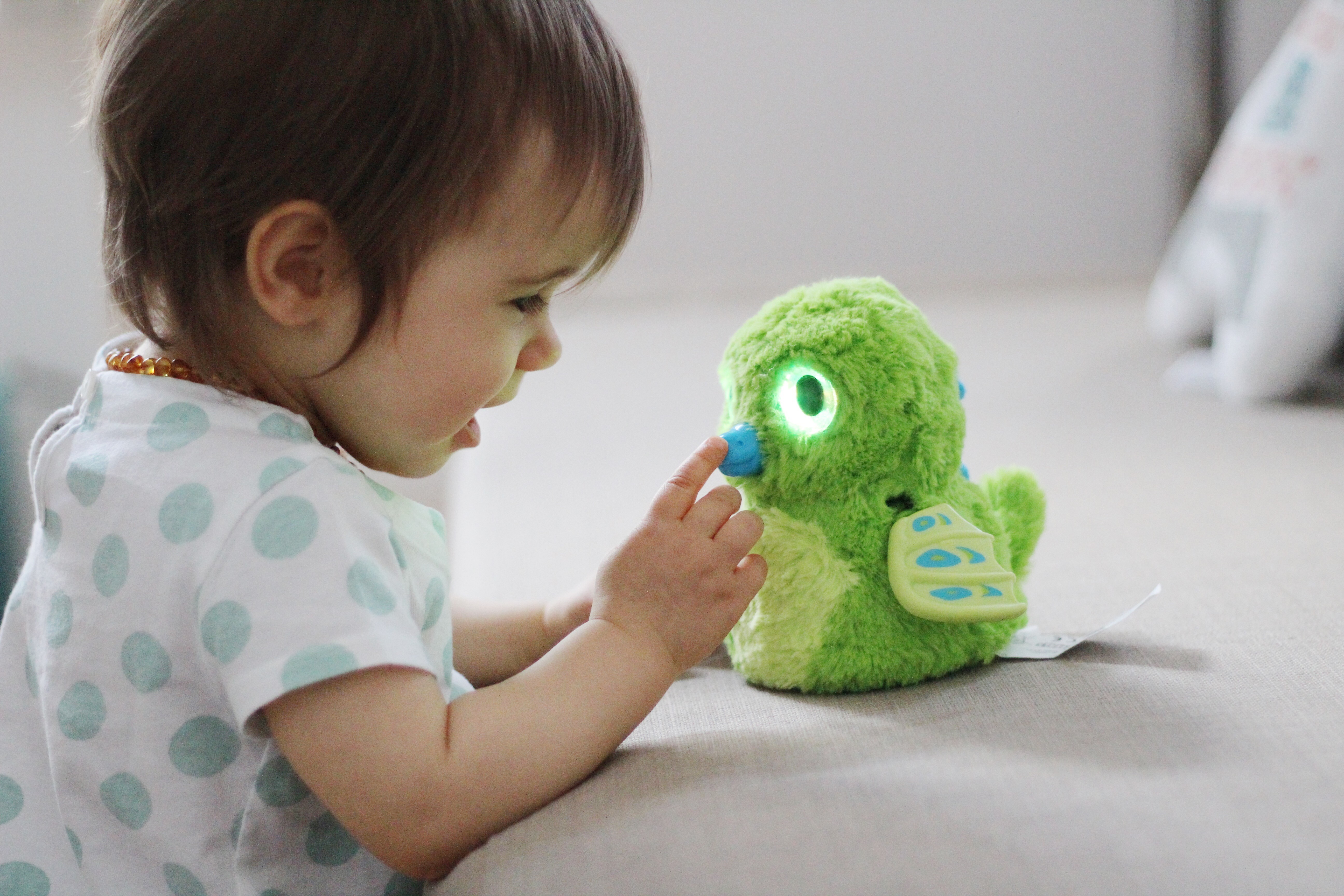 Desde sábado passado que temos connosco o "Nâni" - foi assim que ficou baptizado - já percebemos que pertence aos Draggles e que a sua cor é (como se vê) o verde. Desde então, tem sido a loucura e o Vicente anda com o seu filho para todo o lado, já o apanhei a dar-lhe beijinhos e festinhas, sem mencionar que entrou imediatamente para a categoria dos bonecos proibidos para a irmã. Ainda assim, a Laura tem um fascínio pelo bichinho que vocês não imaginam, delira quando muda a cor dos olhos, quando interage e fala. É muito fofo observá-los, devo dizer e quando o irmão não está, eu deixo-a brincar com ele (não contem ao Vicente :) ).